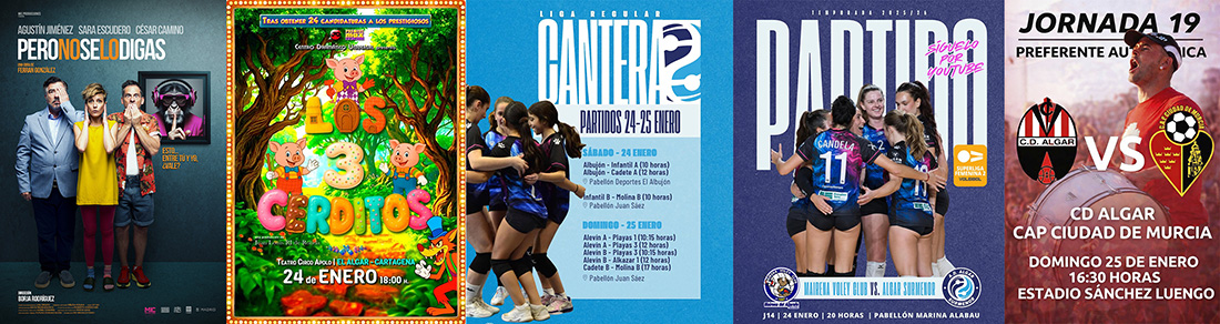 'Pero no se lo digas' y 'Los 3 cerditos' son los títulos de las puestas en escena que pasarán por el Apolo esta noche y mañana tarde, respectivamente, mientras que en el deporte sobresale el duelo de rivalidad entre CD Los Urrutias y CB Sierramar en el pabellón algareño. En voleibol hay concentración de partidos alevines el domingo por la mañana, mientras que el primer equipo viaja a tierra sevillanas para un duelo crucial. En fútbol, juegan en el Sánchez Luengo las escuadras del CD Algar de preferente y de segunda autonómica, mientras que viaja a Águilas el juvenil.
