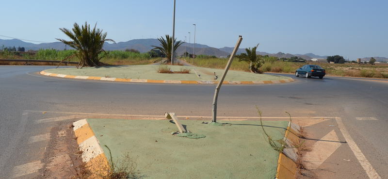 La rotonda de la carretera nacional que da acceso a la población de Los Urrutias lleva todo el verano sin indicaciones escritas sobre los pueblos limítrofes.